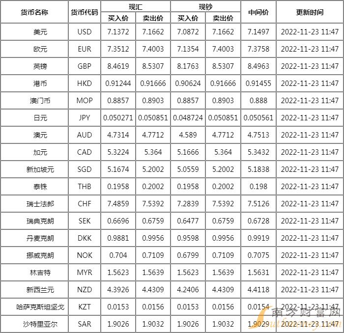中信银行外汇牌价表 11月23日中信银行外币汇率多少?下面同南方财富网吾浦君来看看