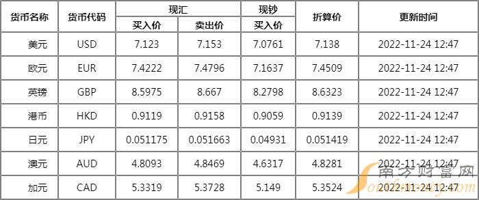 邮储银行外汇牌价表 11月24日邮储银行人民币汇率多少?下面同南方财富网小V来看看。