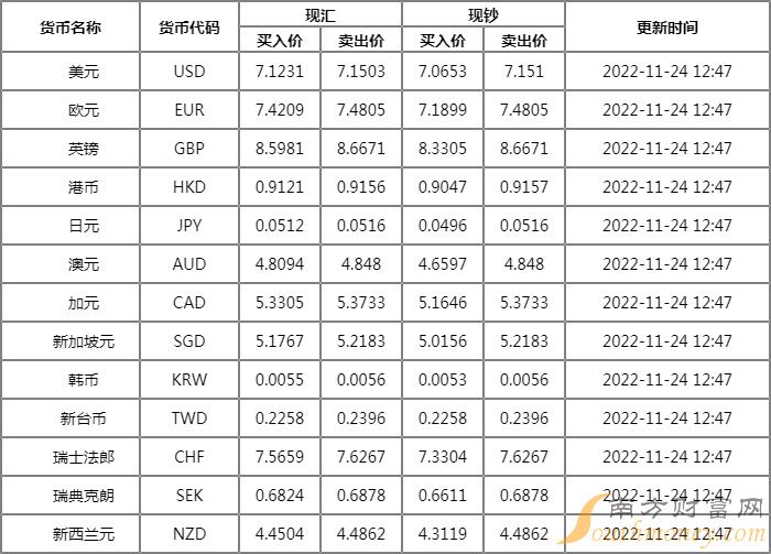兴业银行外汇牌价表 11月24日兴业银行人民币汇率多少?下面同南方财富网微聊君来看看。