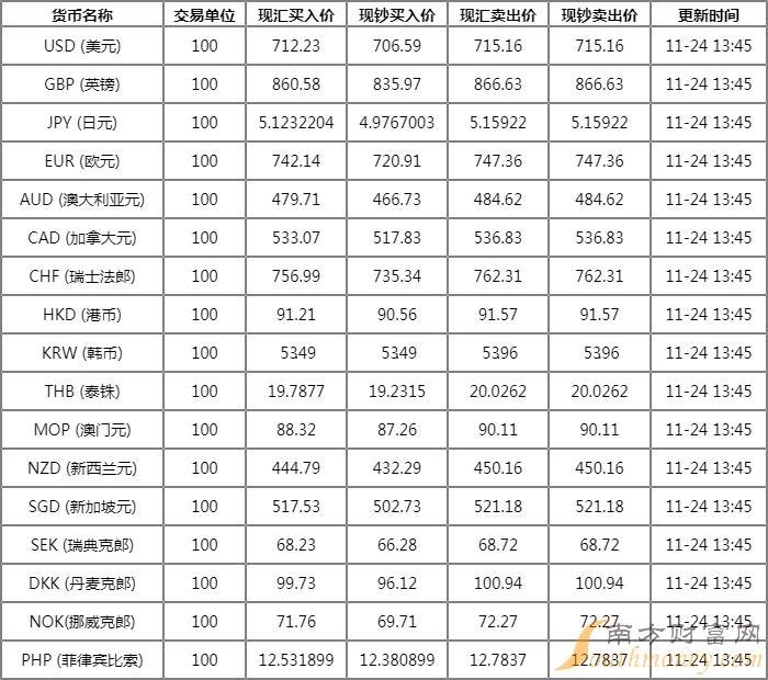 浦发银行外汇牌价表 11月24日浦发银行人民币汇率多少?下面同南方财富网胡V来看看。