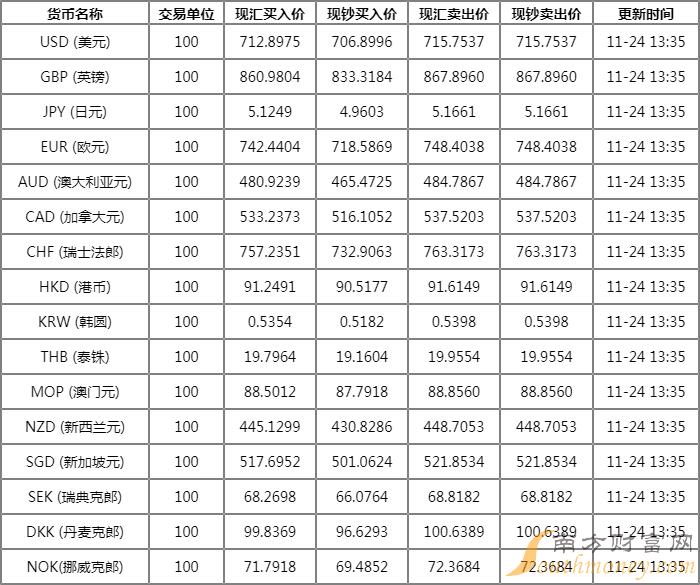 光大银行外汇牌价表 11月24日光大银行人民币汇率多少?下面同南方财富网胡V来看看。