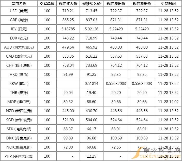 交通银行外汇牌价表一览 11月28日交行人民币汇率多少?下面同南方财富网搜罗君来看看。