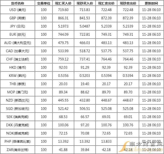 中国工商银行外汇牌价表一览 11月28日工行人民币汇率多少?下面同南方财富网财言君来看看。