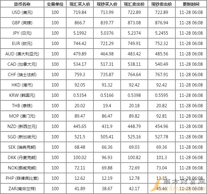 中国银行外汇牌价表一览 11月28日中行人民币汇率多少?下面同南方财富网微聊君来看看。
