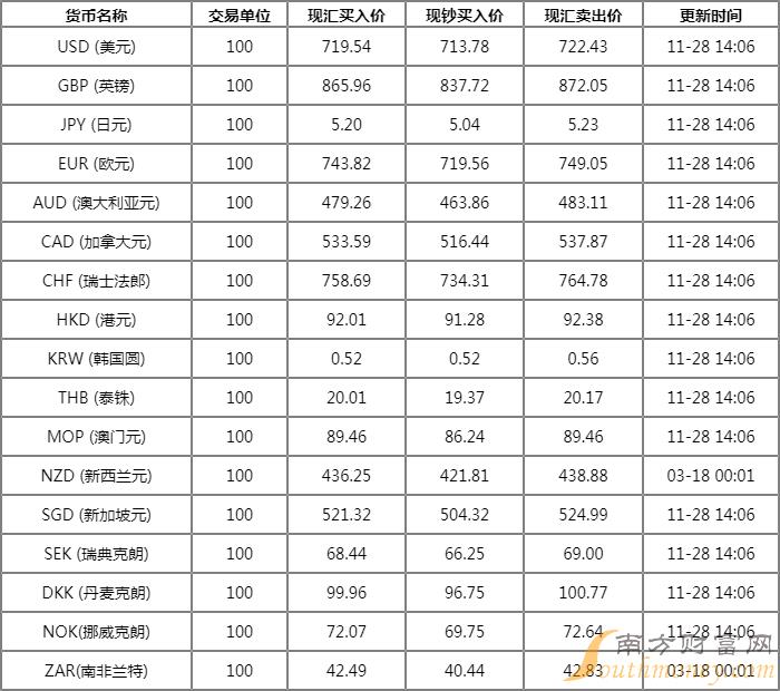 中国农业银行外汇牌价表一览 11月28日农行人民币汇率多少?下面同南方财富网蓝天来看看。