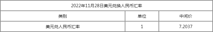人民币对美元上一交易日收7.1615,11月28日开盘价为7.2300。人民币对美元汇率日内开盘后小幅震荡。截至11月28日上午10时,人民币对美元汇率报7.2290,日内下贬幅度为0.94%;人民币对美元汇率报7.2459,日内下贬幅度为0.73%。