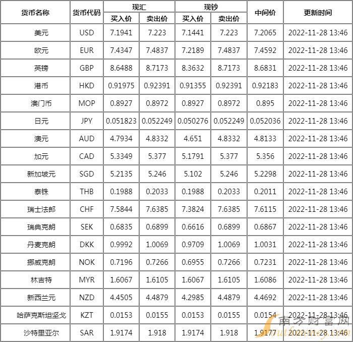 人民币对美元上一交易日收7.1615,11月28日开盘价为7.2300。人民币对美元汇率日内开盘后小幅震荡。截至11月28日上午10时,人民币对美元汇率报7.2290,日内下贬幅度为0.94%;人民币对美元汇率报7.2459,日内下贬幅度为0.73%。