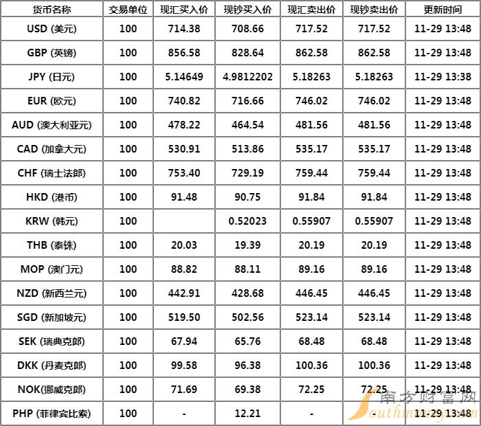交通银行外汇牌价表一览 11月29日交通银行人民币汇率多少?下面同南方财富网小狮子来看看。