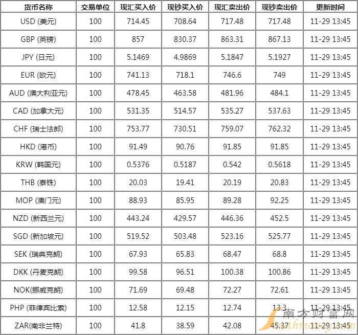 中国银行外汇牌价表一览 11月29日中国银行人民币汇率多少?下面同南方财富网小鹿来看看。