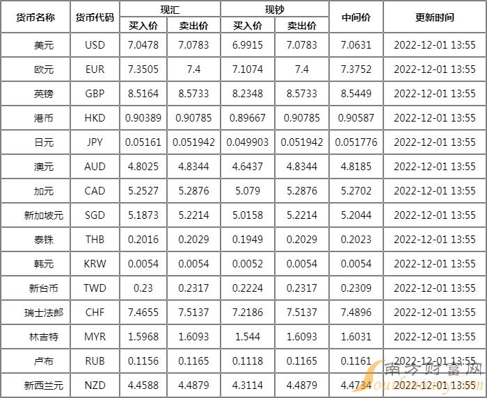 12月1日平安银行外汇牌价表 平安银行人民币对美元汇率是多少?下面同南方财富网小南来看看。