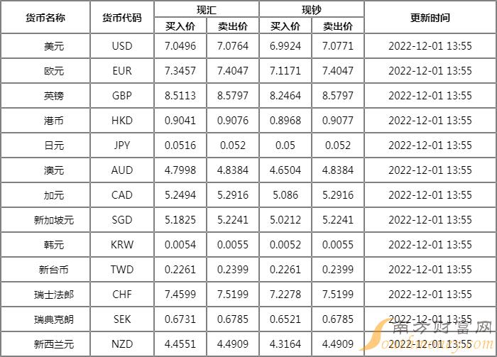 12月1日兴业银行外汇牌价表 兴业银行人民币对美元汇率是多少?下面同南方财富网蝴蝶君来看看。