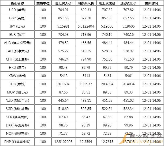 12月1日浦发银行外汇牌价表 浦发银行人民币对美元汇率是多少?下面同南方财富网大眼君来看看。