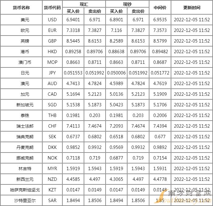 2022年中信银行外汇牌价表 12月5日中信银行人民币汇率是多少?下面同南方财富网默默来了解一下。