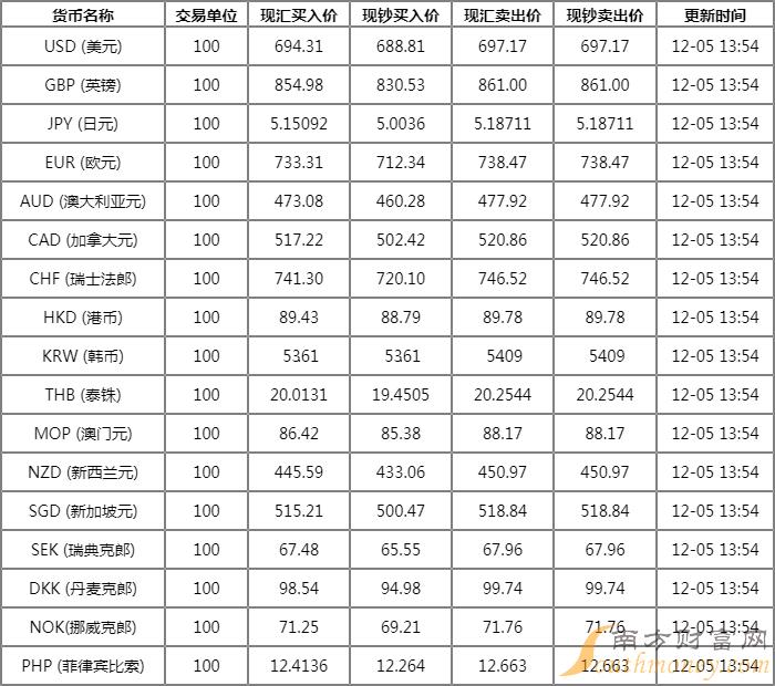 浦发银行外汇牌价表 12月5日浦发银行人民币汇率是多少?下面同南方财富网小蔡来了解一下。