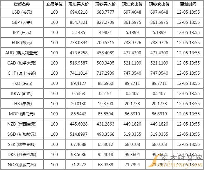 人民币对美元上一交易日收7.0380,12月5日开盘价为6.9900。人民币对美元汇率日内率先上涨超600基点,重返7.0关口上方。截至12月5日上午10时,人民币对美元汇率报6.9815,日内升值幅度为0.80%;人民币对美元汇率报6.9702,日内下贬幅度为0.79%。
