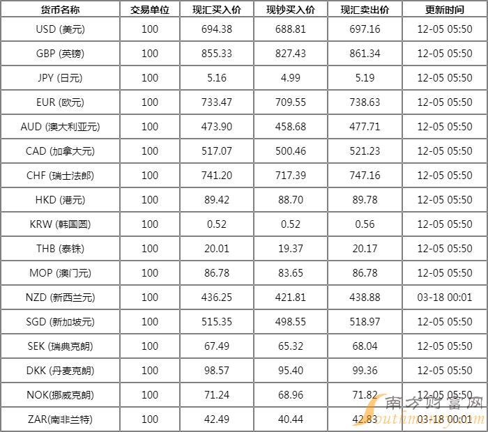中国农业银行外汇牌价表 12月5日农行人民币汇率是多少?下面同南方财富网小南来了解一下。