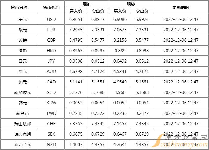 兴业银行外汇牌价表 12月6日兴业银行人民币汇率多少?下面同南方财富网点金君来看看。