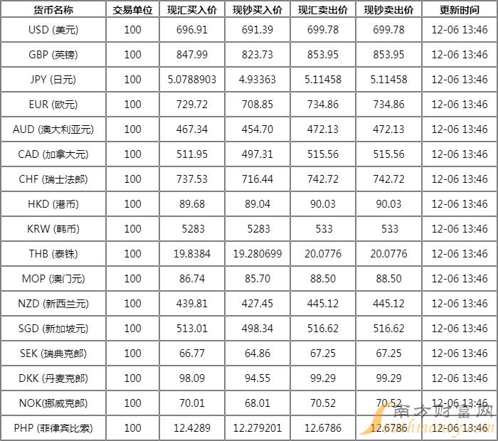 浦发银行外汇牌价表 12月6日浦发银行人民币汇率多少?下面同南方财富网看点君来看看。