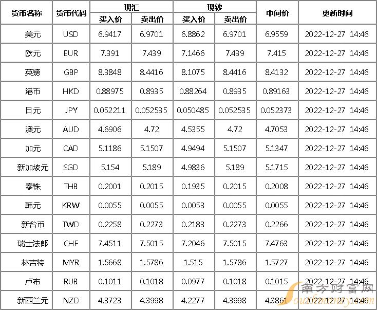 2022年12月27日银行间外汇市场人民币汇率中间价为:1美元对人民币6.9546元,1欧元对人民币7.4007元,100日元对人民币5.2391元,1港元对人民币0.89139元,1英镑对人民币8.4003元,1澳大利亚元对人民币4.6902元,1新西兰元对人民币4.3831元,1新加坡元对人民币5.1618元,1瑞士法郎对人民币7.4621元,1加拿大元对人民币5.1273元,人民币1元对0.63571马来西亚林吉特,人民币1元对9.8558俄罗斯卢布,人民币1元对2.4501南非兰特,人民币1元对183.18韩元,人民币1元对0.52806阿联酋迪拉姆,人民币1元对0.54074沙特里亚尔,人民币1元对54.0658匈牙利福林,人民币1元对0.62721波兰兹罗提,人民币1元对1.0050丹麦克朗,人民币1元对1.5091瑞典克朗,人民币1元对1.4141挪威克朗,人民币1元对2.68532土耳其里拉,人民币1元对2.7850墨西哥比索,人民币1元对4.9818泰铢。