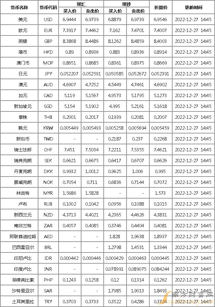 中国银行外汇牌价表 12月27日中国银行人民币汇率多少?下面同南方财富网笔记君来看看。