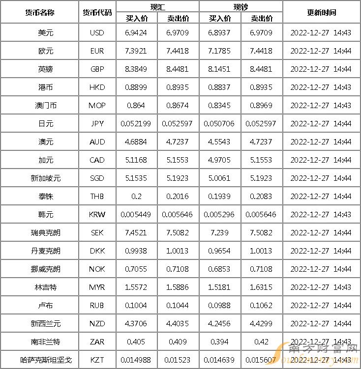 建设银行外汇牌价表 12月27日建设银行人民币汇率多少?下面同南方财富网袋袋君来看看。