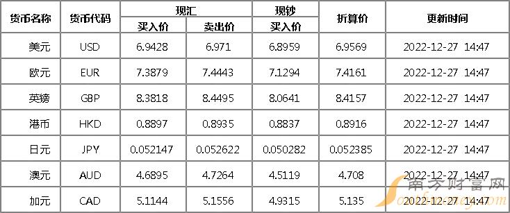 邮储银行外汇牌价表 12月27日邮储银行人民币汇率多少?下面同南方财富网富贵君来看看。