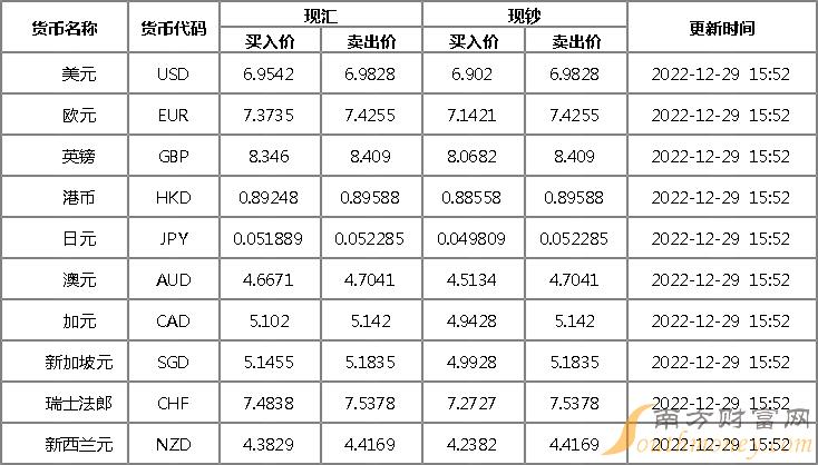 xm外汇:浙商银行外汇牌价一览表 2022年12月29日