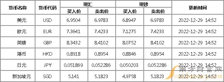 渤海银行外汇牌价一览表 12月29日渤海银行人民币对美元汇率多少。下面同南方财富网吾浦君来看看。