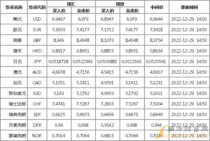 2022年12月29日银行间外汇市场人民币汇率中间价为:1美元对人民币6.9793元,1欧元对人民币7.4161元,100日元对人民币5.2031元,1港元对人民币0.89573元,1英镑对人民币8.3964元,1澳大利亚元对人民币4.7087元,1新西兰元对人民币4.4078元,1新加坡元对人民币5.1713元,1瑞士法郎对人民币7.5208元,1加拿大元对人民币5.1322元,人民币1元对0.63381马来西亚林吉特,人民币1元对10.3487俄罗斯卢布,人民币1元对2.4547南非兰特,人民币1元对181.94韩元,人民币1元对0.52614阿联酋迪拉姆,人民币1元对0.53854沙特里亚尔,人民币1元对54.1562匈牙利福林,人民币1元对0.63236波兰兹罗提,人民币1元对1.0026丹麦克朗,人民币1元对1.4989瑞典克朗,人民币1元对1.4166挪威克朗,人民币1元对2.68098土耳其里拉,人民币1元对2.7843墨西哥比索,人民币1元对4.9730泰铢。