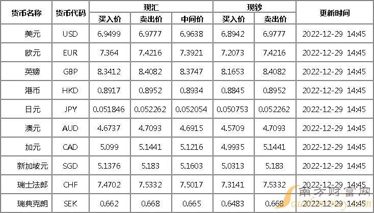 华夏银行外汇牌价一览表 12月29日华夏银行人民币对美元汇率多少。下面同南方财富网路路来看看。