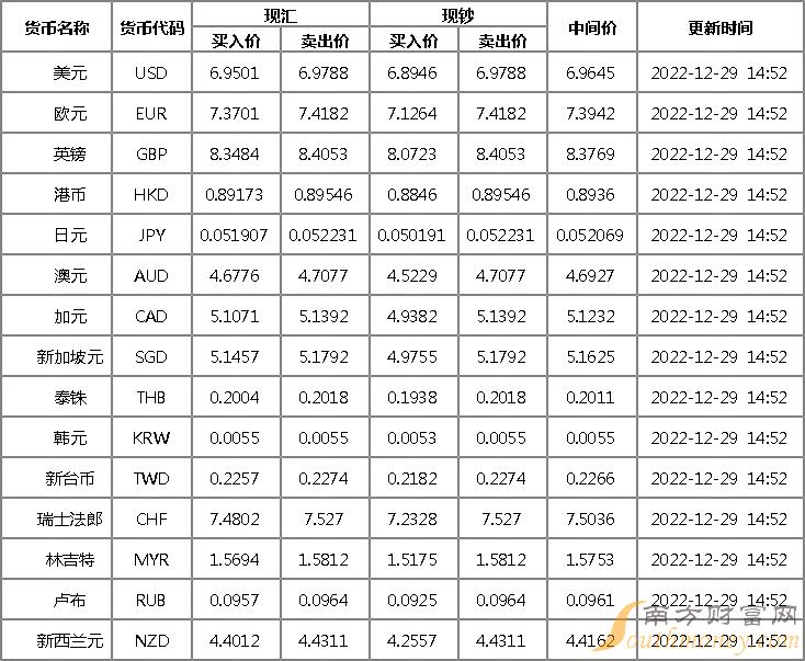 平安银行外汇牌价一览表 12月29日平安银行人民币对美元汇率多少。下面同南方财富网小股来看看。