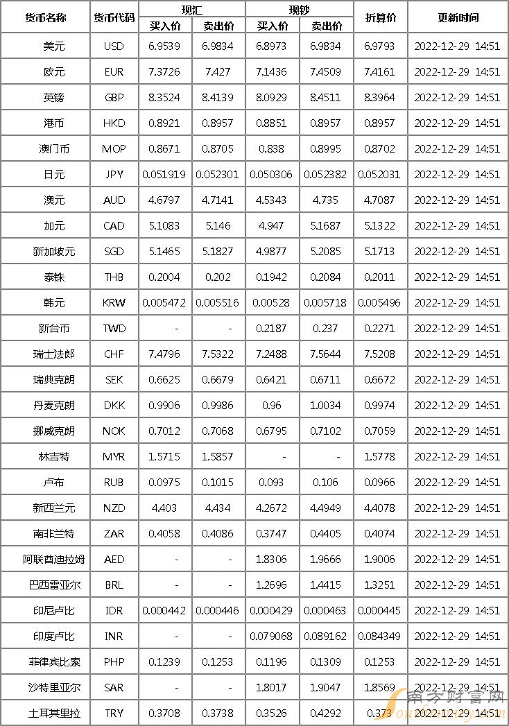 中国银行外汇牌价一览表 12月29日中国银行人民币对美元汇率多少。下面同南方财富网老李来看看。