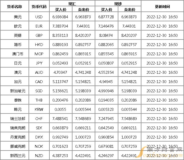 光大银行外汇牌价一览表 12月30日光大银行人民币美元汇率多少?今日南方财富网小股来看看。