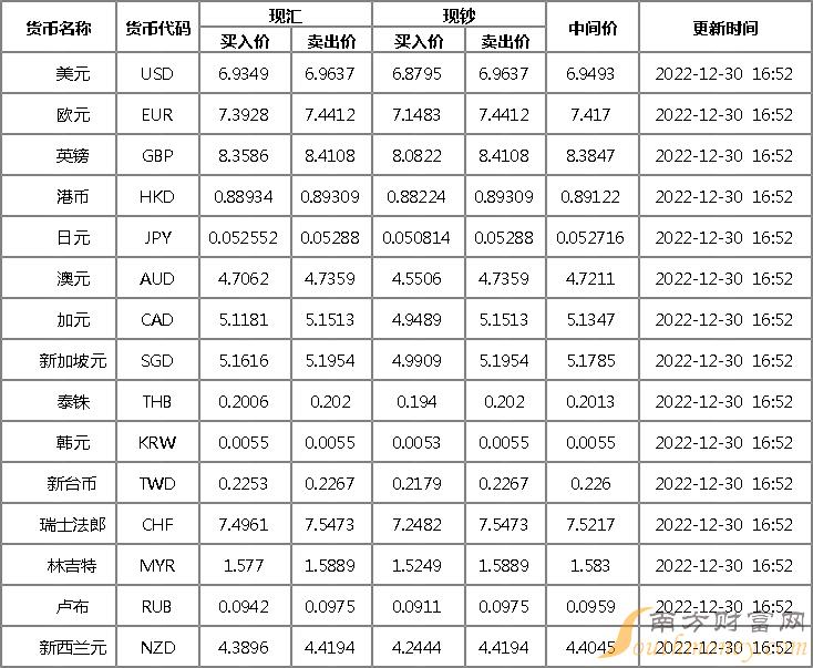 2022年12月30日银行间外汇市场人民币汇率中间价为:1美元对人民币6.9646元,1欧元对人民币7.4229元,100日元对人民币5.2358元,1港元对人民币0.89327元,1英镑对人民币8.3941元,1澳大利亚元对人民币4.7138元,1新西兰元对人民币4.4162元,1新加坡元对人民币5.1831元,1瑞士法郎对人民币7.5432元,1加拿大元对人民币5.1385元,人民币1元对0.63405马来西亚林吉特,人民币1元对10.6193俄罗斯卢布,人民币1元对2.4312南非兰特,人民币1元对181.06韩元,人民币1元对0.52726阿联酋迪拉姆,人民币1元对0.53971沙特里亚尔,人民币1元对53.8329匈牙利福林,人民币1元对0.62980波兰兹罗提,人民币1元对1.0017丹麦克朗,人民币1元对1.5017瑞典克朗,人民币1元对1.4201挪威克朗,人民币1元对2.68597土耳其里拉,人民币1元对2.7958墨西哥比索,人民币1元对4.9647泰铢。