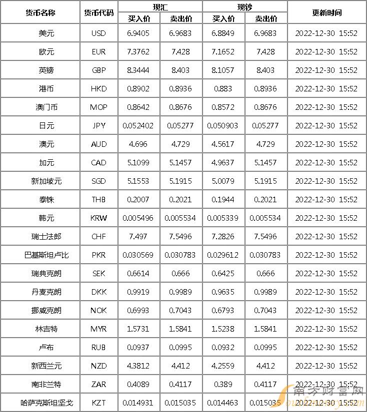 工商银行外汇牌价表 12月30日工商银行人民币汇率多少?今日南方财富网小V来看看。