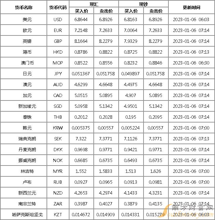 2023年1月6日银行间外汇市场人民币汇率中间价为:1美元对人民币6.8912元,1欧元对人民币7.2535元,100日元对人民币5.1665元,1港元对人民币0.88186元,1英镑对人民币8.2071元,1澳大利亚元对人民币4.6600元,1新西兰元对人民币4.2960元,1新加坡元对人民币5.1236元,1瑞士法郎对人民币7.3615元,1加拿大元对人民币5.0799元,人民币1元对0.63785马来西亚林吉特,人民币1元对10.4956俄罗斯卢布,人民币1元对2.4908南非兰特,人民币1元对184.60韩元,人民币1元对0.53321阿联酋迪拉姆,人民币1元对0.54560沙特里亚尔,人民币1元对54.7035匈牙利福林,人民币1元对0.64590波兰兹罗提,人民币1元对1.0258丹麦克朗,人民币1元对1.5504瑞典克朗,人民币1元对1.4877挪威克朗,人民币1元对2.72517土耳其里拉,人民币1元对2.8046墨西哥比索,人民币1元对4.9402泰铢。