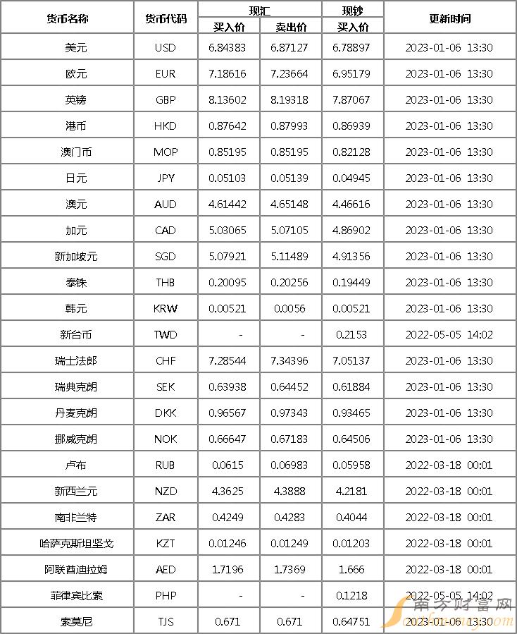 农业银行外汇牌价表1月6日 农业银行人民币美元汇率多少?下面同南方财富网老李来看看。