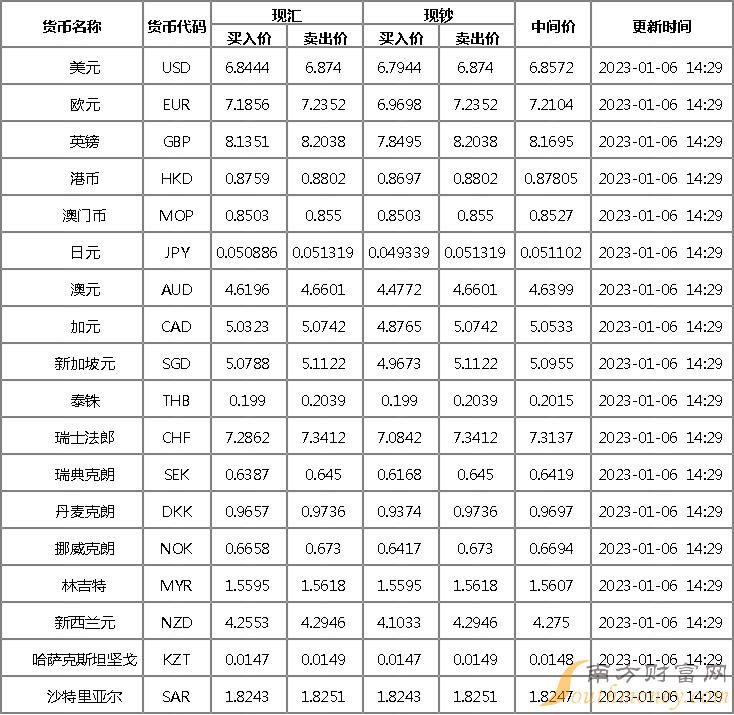 2023年1月6日银行间外汇市场人民币汇率中间价为:1美元对人民币6.8912元,1欧元对人民币7.2535元,100日元对人民币5.1665元,1港元对人民币0.88186元,1英镑对人民币8.2071元,1澳大利亚元对人民币4.6600元,1新西兰元对人民币4.2960元,1新加坡元对人民币5.1236元,1瑞士法郎对人民币7.3615元,1加拿大元对人民币5.0799元,人民币1元对0.63785马来西亚林吉特,人民币1元对10.4956俄罗斯卢布,人民币1元对2.4908南非兰特,人民币1元对184.60韩元,人民币1元对0.53321阿联酋迪拉姆,人民币1元对0.54560沙特里亚尔,人民币1元对54.7035匈牙利福林,人民币1元对0.64590波兰兹罗提,人民币1元对1.0258丹麦克朗,人民币1元对1.5504瑞典克朗,人民币1元对1.4877挪威克朗,人民币1元对2.72517土耳其里拉,人民币1元对2.8046墨西哥比索,人民币1元对4.9402泰铢。
