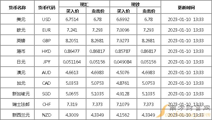 浙商银行外汇牌价一览表 1月10日浙商银行美元汇率是多少?下面同南方财富网大眼君来看看。