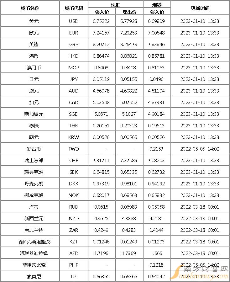 农业银行外汇牌价一览表 1月10日农业银行人民币汇率是多少?下面同南方财富网小狮子来看看。