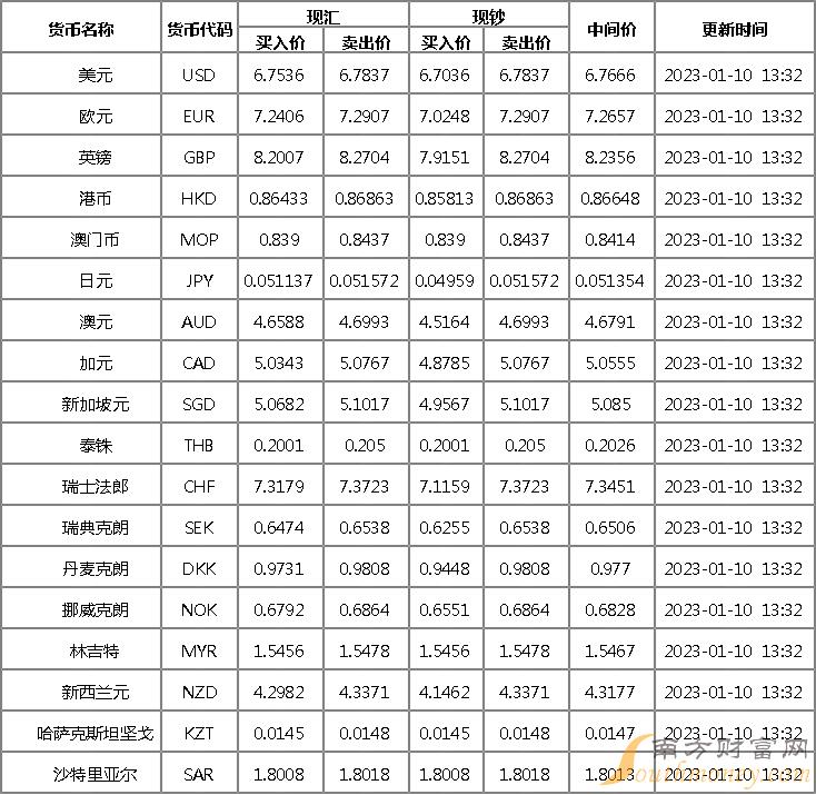 2023年1月10日银行间外汇市场人民币汇率中间价为:1美元对人民币6.7611元,1欧元对人民币7.2549元,100日元对人民币5.1297元,1港元对人民币0.86585元,1英镑对人民币8.2355元,1澳大利亚元对人民币4.6709元,1新西兰元对人民币4.3053元,1新加坡元对人民币5.0813元,1瑞士法郎对人民币7.3401元,1加拿大元对人民币5.0491元,人民币1元对0.64686马来西亚林吉特,人民币1元对10.3113俄罗斯卢布,人民币1元对2.5073南非兰特,人民币1元对183.45韩元,人民币1元对0.54326阿联酋迪拉姆,人民币1元对0.55562沙特里亚尔,人民币1元对54.7101匈牙利福林,人民币1元对0.64690波兰兹罗提,人民币1元对1.0252丹麦克朗,人民币1元对1.5386瑞典克朗,人民币1元对1.4647挪威克朗,人民币1元对2.77396土耳其里拉,人民币1元对2.8316墨西哥比索,人民币1元对4.9451泰铢。