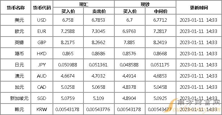 2023年1月11日银行间外汇市场人民币汇率中间价为:1美元对人民币6.7756元,1欧元对人民币7.2746元,100日元对人民币5.1273元,1港元对人民币0.86751元,1英镑对人民币8.2327元,1澳大利亚元对人民币4.6718元,1新西兰元对人民币4.3175元,1新加坡元对人民币5.0893元,1瑞士法郎对人民币7.3425元,1加拿大元对人民币5.0474元,人民币1元对0.64526马来西亚林吉特,人民币1元对10.2732俄罗斯卢布,人民币1元对2.5109南非兰特,人民币1元对183.34韩元,人民币1元对0.54201阿联酋迪拉姆,人民币1元对0.55400沙特里亚尔,人民币1元对54.7965匈牙利福林,人民币1元对0.64453波兰兹罗提,人民币1元对1.0221丹麦克朗,人民币1元对1.5369瑞典克朗,人民币1元对1.4726挪威克朗,人民币1元对2.77090土耳其里拉,人民币1元对2.8138墨西哥比索,人民币1元对4.9383泰铢。