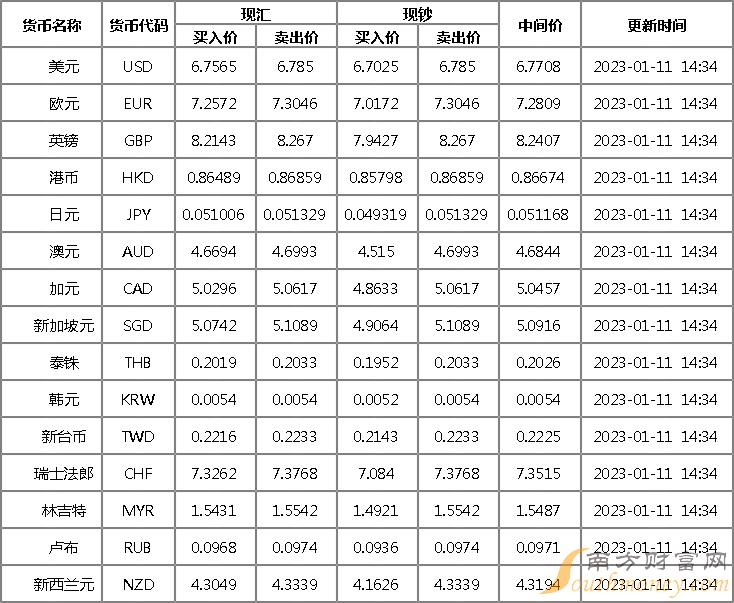 2023年1月11日银行间外汇市场人民币汇率中间价为:1美元对人民币6.7756元,1欧元对人民币7.2746元,100日元对人民币5.1273元,1港元对人民币0.86751元,1英镑对人民币8.2327元,1澳大利亚元对人民币4.6718元,1新西兰元对人民币4.3175元,1新加坡元对人民币5.0893元,1瑞士法郎对人民币7.3425元,1加拿大元对人民币5.0474元,人民币1元对0.64526马来西亚林吉特,人民币1元对10.2732俄罗斯卢布,人民币1元对2.5109南非兰特,人民币1元对183.34韩元,人民币1元对0.54201阿联酋迪拉姆,人民币1元对0.55400沙特里亚尔,人民币1元对54.7965匈牙利福林,人民币1元对0.64453波兰兹罗提,人民币1元对1.0221丹麦克朗,人民币1元对1.5369瑞典克朗,人民币1元对1.4726挪威克朗,人民币1元对2.77090土耳其里拉,人民币1元对2.8138墨西哥比索,人民币1元对4.9383泰铢。