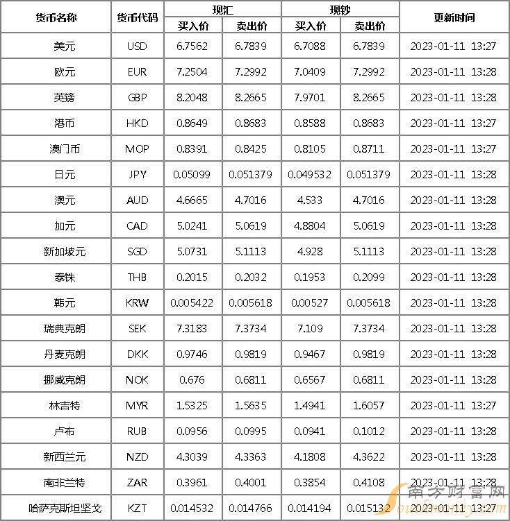 建设银行外汇牌价表1月11日 建设银行人民币对美元汇率多少?下面同南方财富网小语来看看。