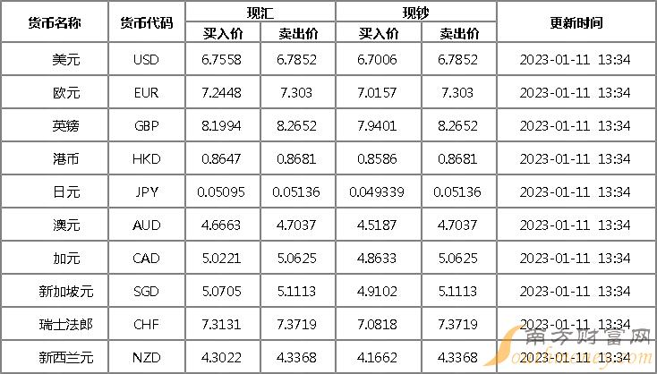 招商银行外汇牌价表1月11日 招商银行人民币对美元汇率多少?下面同南方财富网小股来看看。