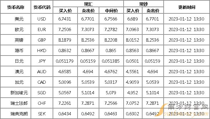 2023年1月12日银行间外汇市场人民币汇率中间价为:1美元对人民币6.7680元,1欧元对人民币7.2877元,100日元对人民币5.1340元,1港元对人民币0.86640元,1英镑对人民币8.2307元,1澳大利亚元对人民币4.6797元,1新西兰元对人民币4.3113元,1新加坡元对人民币5.0883元,1瑞士法郎对人民币7.2720元,1加拿大元对人民币5.0431元,人民币1元对0.64509马来西亚林吉特,人民币1元对10.3888俄罗斯卢布,人民币1元对2.4991南非兰特,人民币1元对183.79韩元,人民币1元对0.54257阿联酋迪拉姆,人民币1元对0.55483沙特里亚尔,人民币1元对54.6517匈牙利福林,人民币1元对0.64303波兰兹罗提,人民币1元对1.0207丹麦克朗,人民币1元对1.5445瑞典克朗,人民币1元对1.4751挪威克朗,人民币1元对2.77397土耳其里拉,人民币1元对2.7995墨西哥比索,人民币1元对4.9304泰铢。