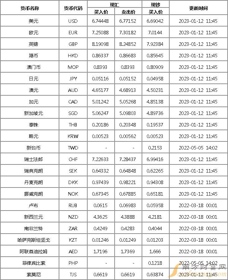 农业银行外汇牌价查询 1月12日农业银行人民币美元汇率中间价多少?下面同南方财富网小鹿来看看。