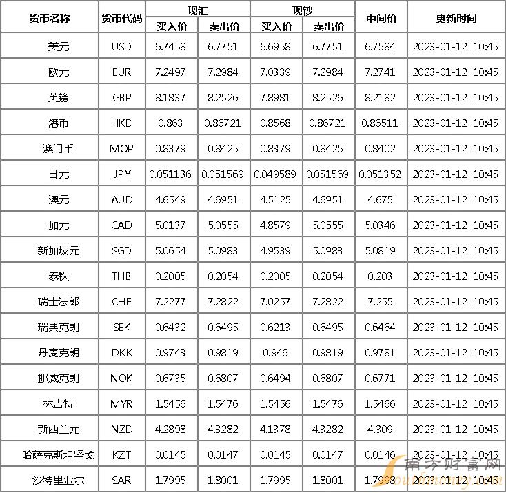 2023年1月12日银行间外汇市场人民币汇率中间价为:1美元对人民币6.7680元,1欧元对人民币7.2877元,100日元对人民币5.1340元,1港元对人民币0.86640元,1英镑对人民币8.2307元,1澳大利亚元对人民币4.6797元,1新西兰元对人民币4.3113元,1新加坡元对人民币5.0883元,1瑞士法郎对人民币7.2720元,1加拿大元对人民币5.0431元,人民币1元对0.64509马来西亚林吉特,人民币1元对10.3888俄罗斯卢布,人民币1元对2.4991南非兰特,人民币1元对183.79韩元,人民币1元对0.54257阿联酋迪拉姆,人民币1元对0.55483沙特里亚尔,人民币1元对54.6517匈牙利福林,人民币1元对0.64303波兰兹罗提,人民币1元对1.0207丹麦克朗,人民币1元对1.5445瑞典克朗,人民币1元对1.4751挪威克朗,人民币1元对2.77397土耳其里拉,人民币1元对2.7995墨西哥比索,人民币1元对4.9304泰铢。