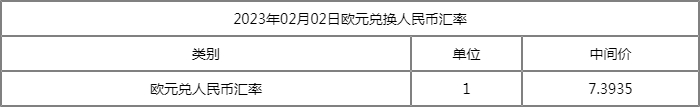 2023年2月2日银行间外汇市场人民币汇率中间价为:1美元对人民币6.7130元,1欧元对人民币7.3935元,100日元对人民币5.2211元,1港元对人民币0.85624元,1英镑对人民币8.3205元,1澳大利亚元对人民币4.7984元,1新西兰元对人民币4.3738元,1新加坡元对人民币5.1430元,1瑞士法郎对人民币7.4048元,1加拿大元对人民币5.0600元,人民币1元对0.63400马来西亚林吉特,人民币1元对10.4356俄罗斯卢布,人民币1元对2.5372南非兰特,人民币1元对182.07韩元,人民币1元对0.54713阿联酋迪拉姆,人民币1元对0.55899沙特里亚尔,人民币1元对52.7452匈牙利福林,人民币1元对0.63624波兰兹罗提,人民币1元对1.0062丹麦克朗,人民币1元对1.5357瑞典克朗,人民币1元对1.4722挪威克朗,人民币1元对2.80205土耳其里拉,人民币1元对2.7707墨西哥比索,人民币1元对4.8814泰铢。