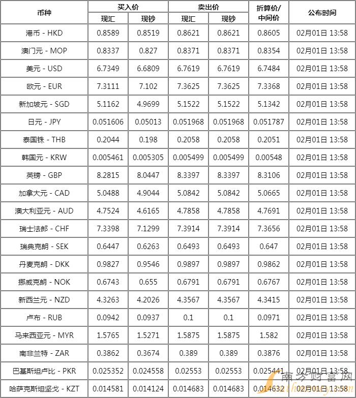 2月1日消息 今日人民币兑美元中间价6.7492元,较上一交易日(1月31日)的6.7604元上调112个基点。